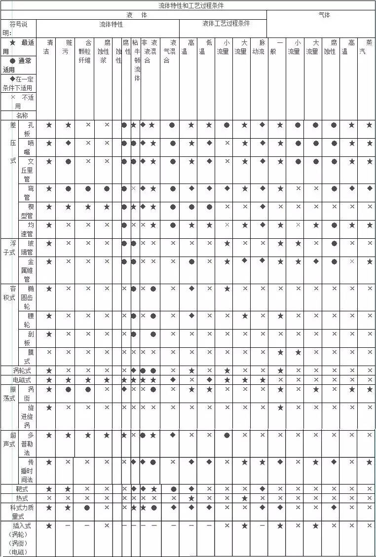 表1???流量計流體特性和工藝過程條件選型一覽表