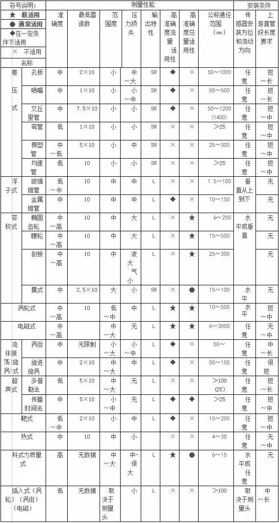 表2???流量計測量性能、安裝條件選型一覽表